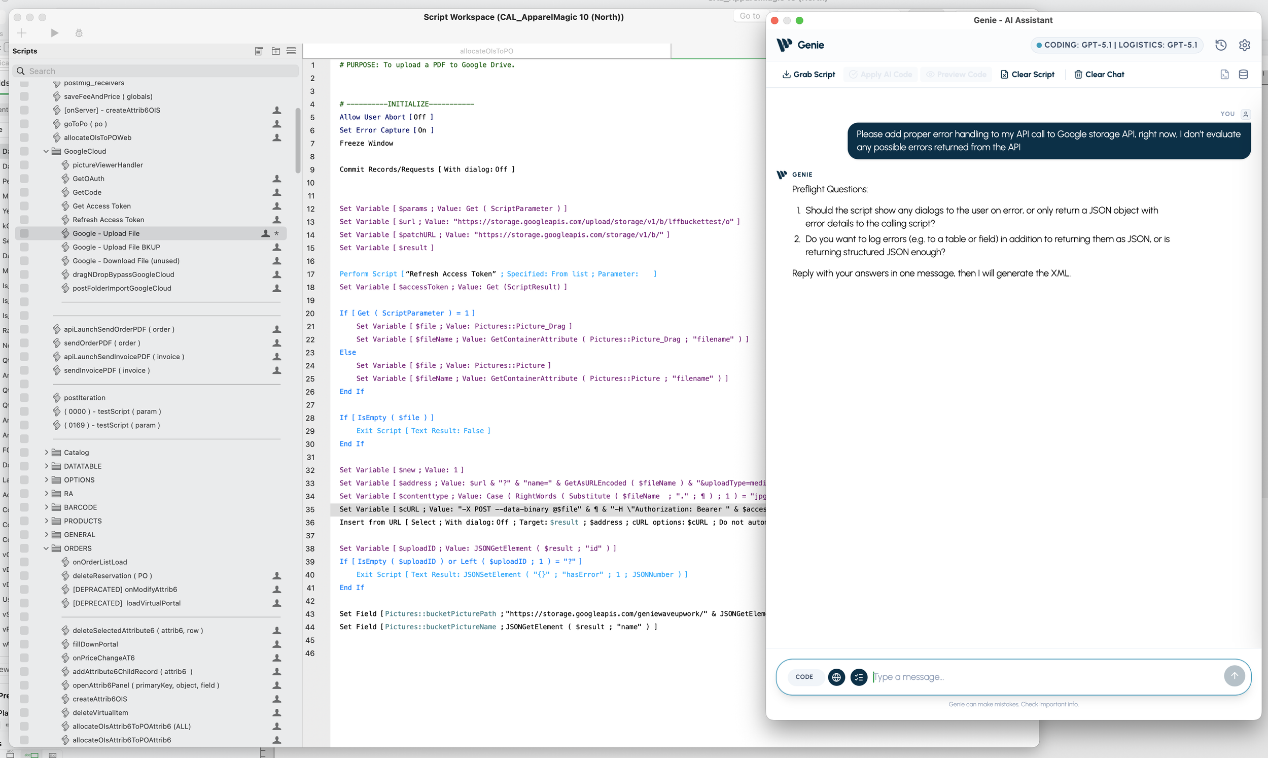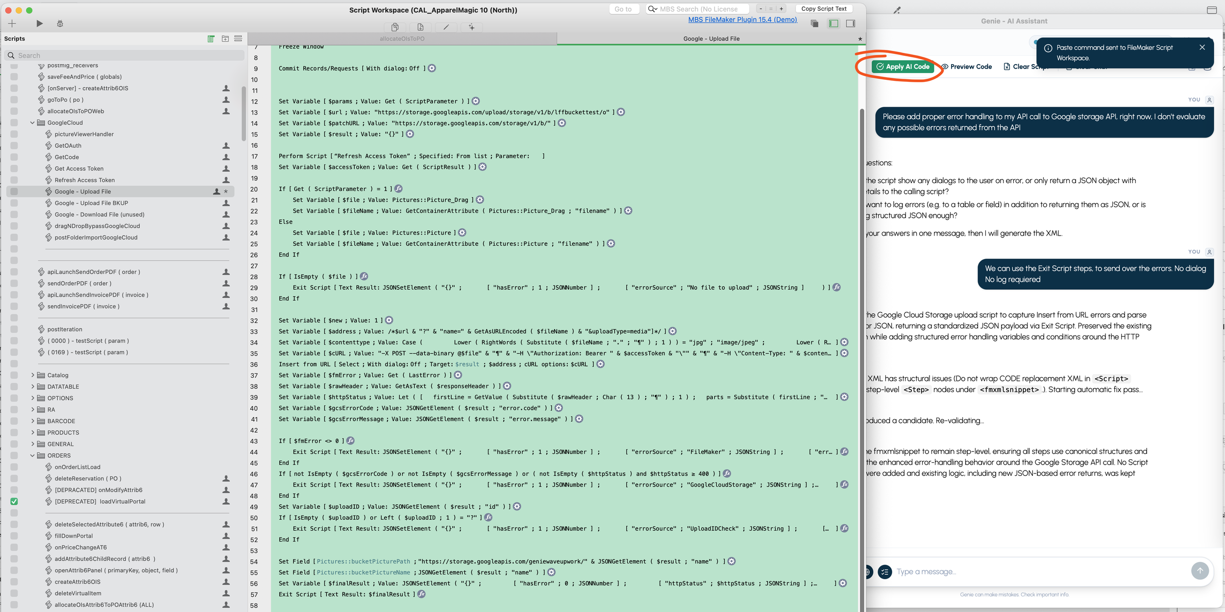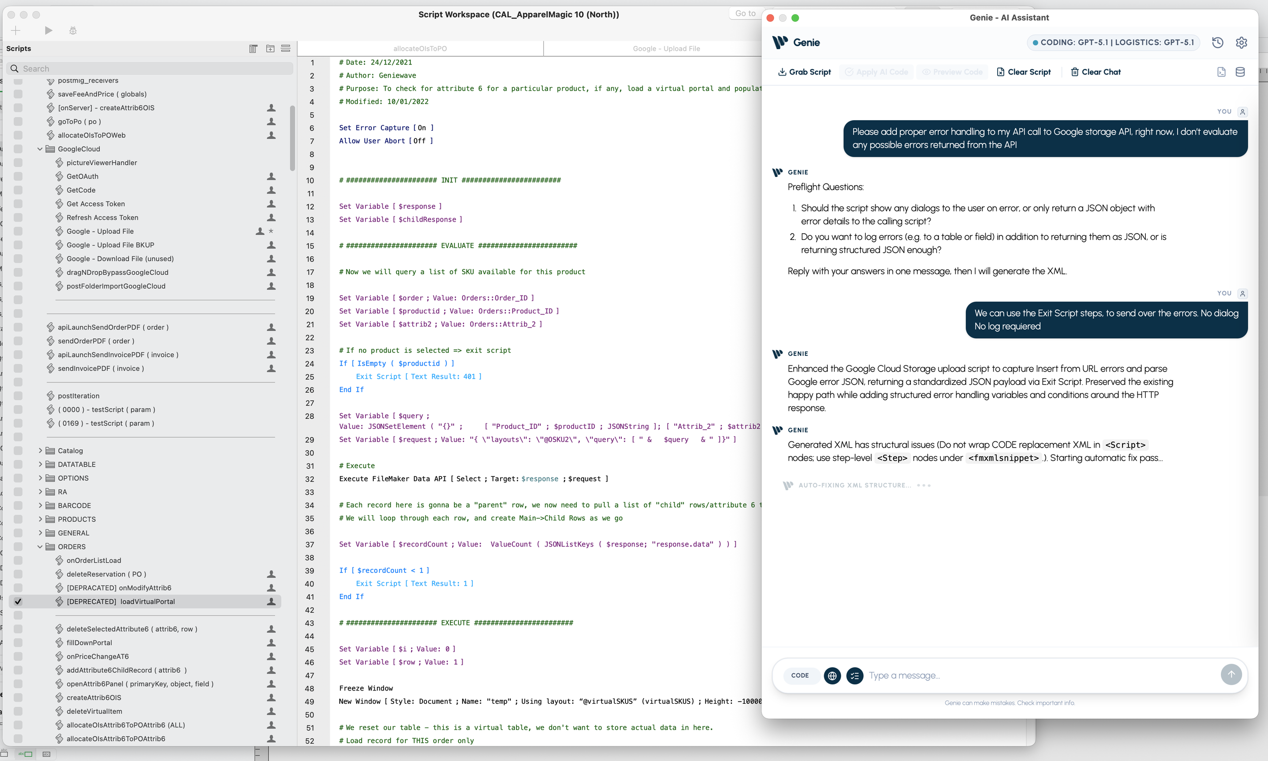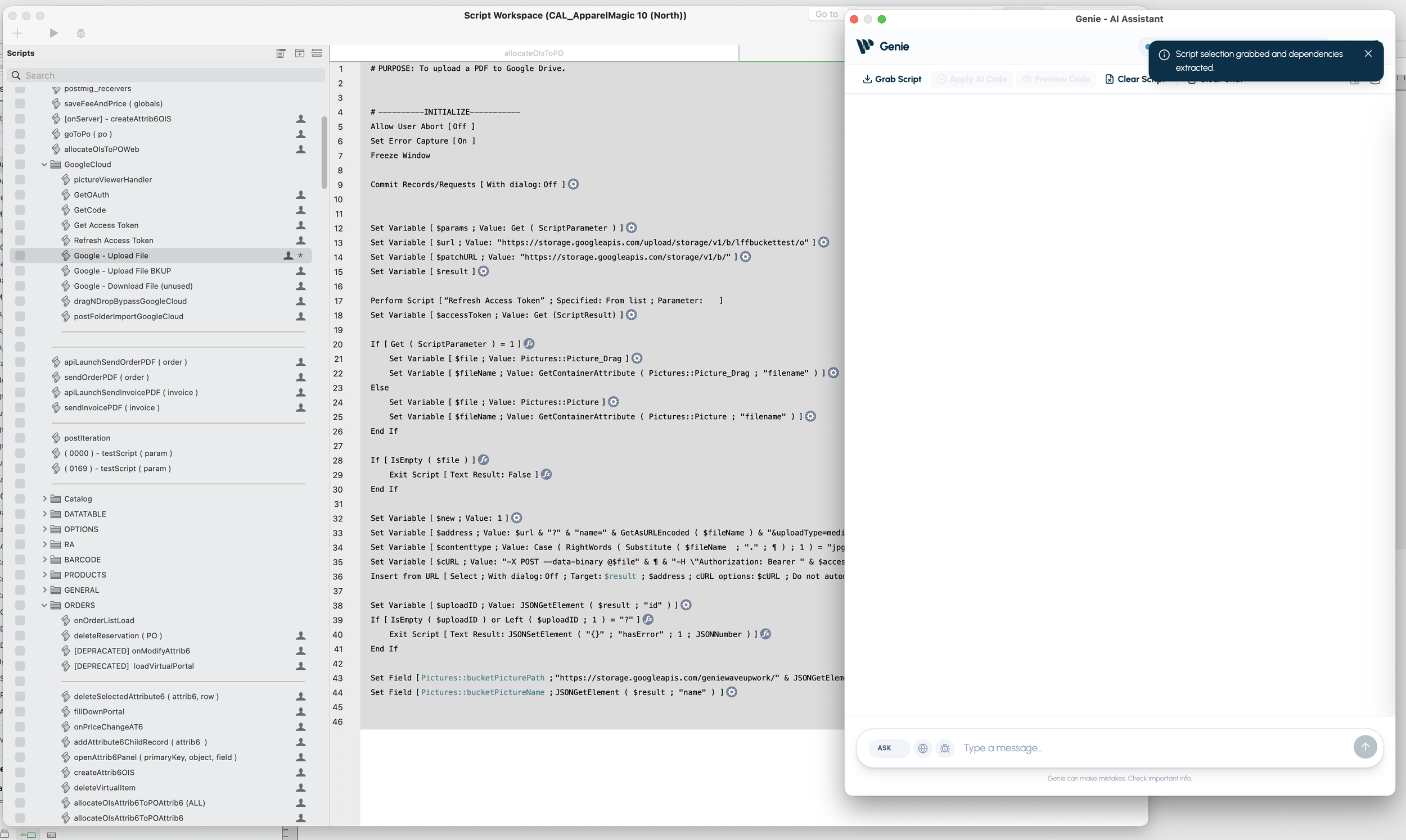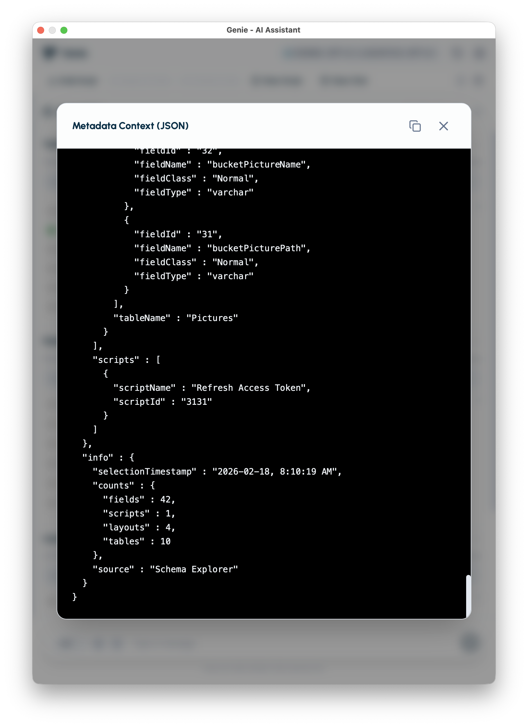 So when you ask “update this script,” Genie can attach the right context (layout IDs, table IDs, field IDs, etc.) to the request.