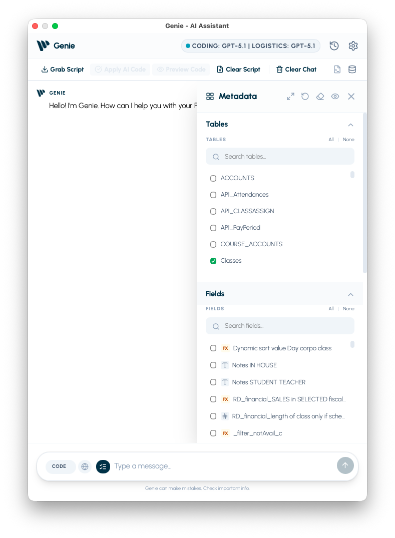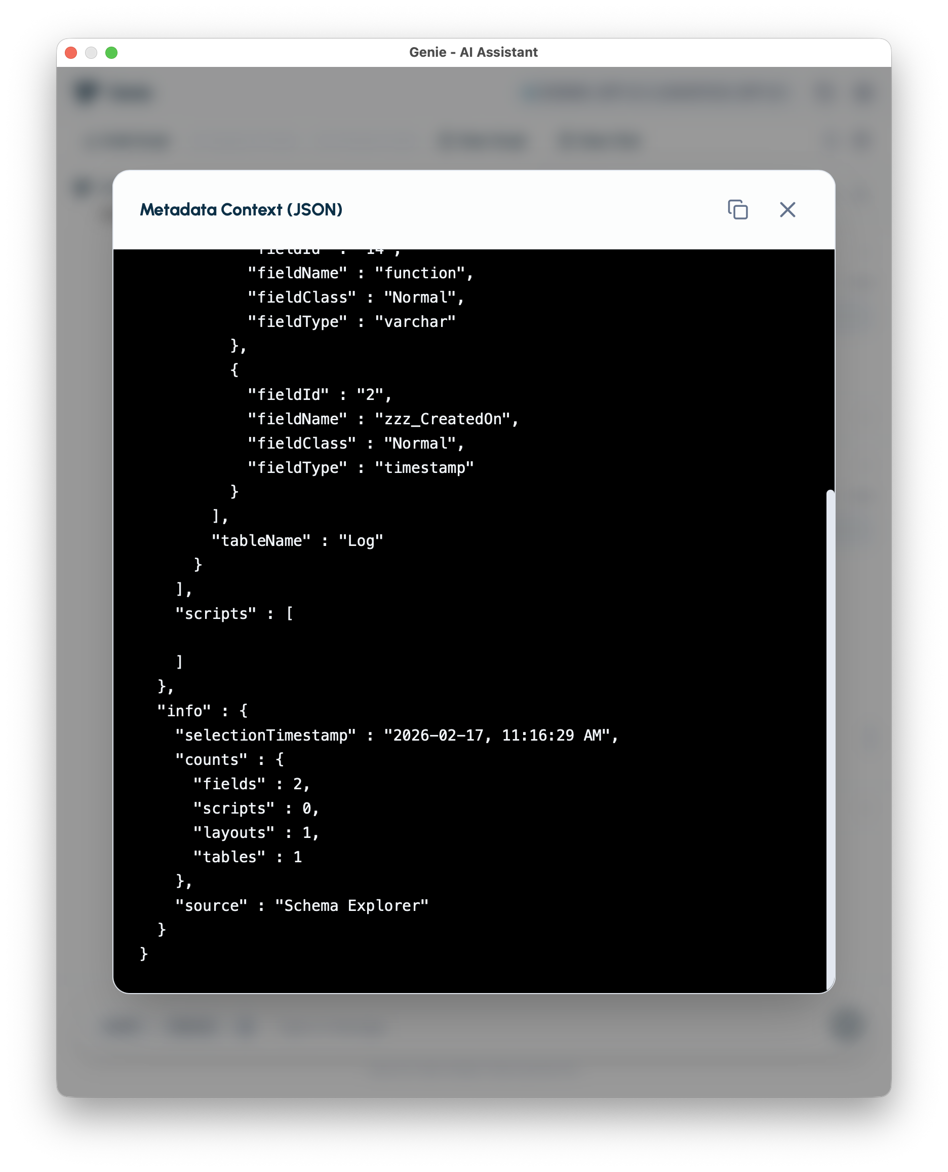 Select tables, fields, layouts, and script headers to give Genie precise, app-specific context for higher-quality output.